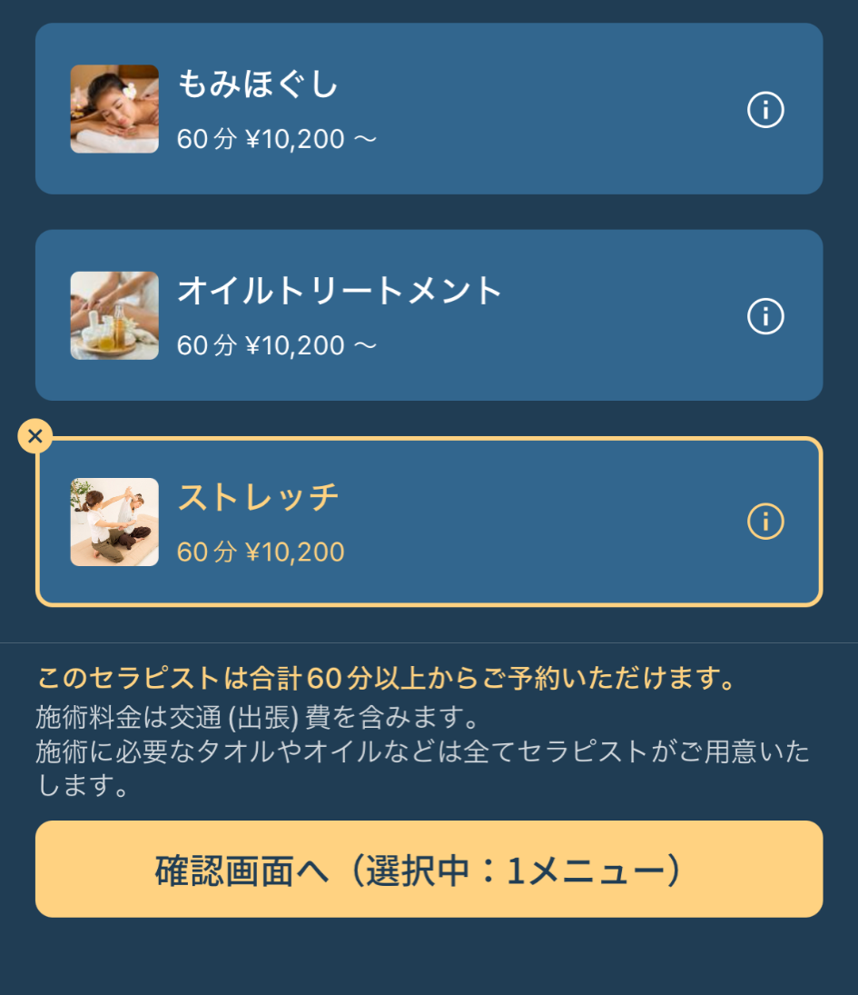 荷物はセラピストさんが持ってきてくれるので特に準備する必要もなく、移動がないこと、そのまま寝られるのが本当に楽で利用し続けています。指名料・出張費込みの税込料金で様々なセラピストがいるので料金やレビューを見て選ぶ楽しさがあります。
