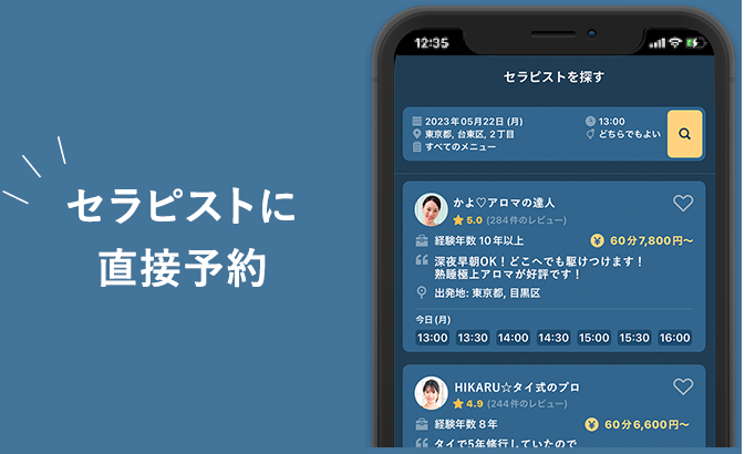 お好きな日時・場所・希望条件を選択すると対応可能なセラピストが表示されます。セラピストに予約リクエストをしてマッチング成立すると予約完了です。